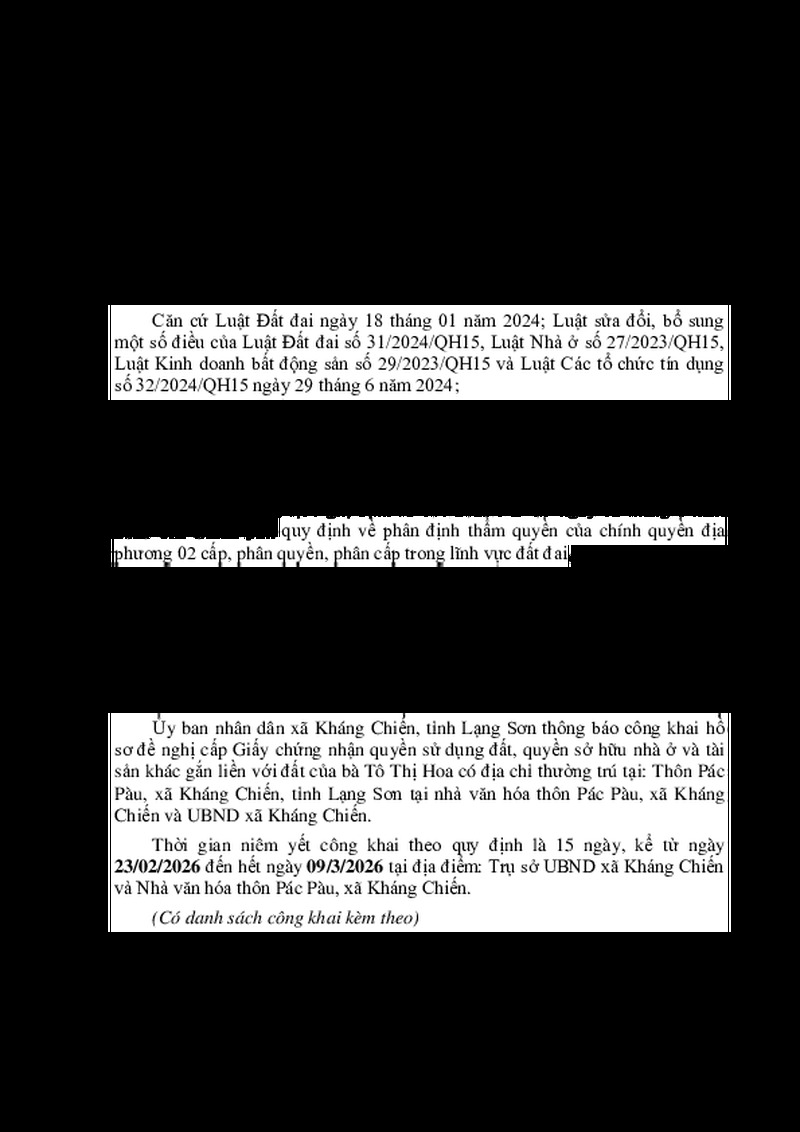 | Tiêu đề văn bản | Thông báo về việc công khai hồ sơ đề nghị cấp giấy chứng nhận quyền sử dụng đất, quyền sở hữu nhà ở và tài sản khác gắn liền với đất của bà Tô Thị Hoa có địa chỉ thường trú tại: Thôn Pác Pàu, xã Kháng Chiến, tỉnh Lạng Sơn | ||