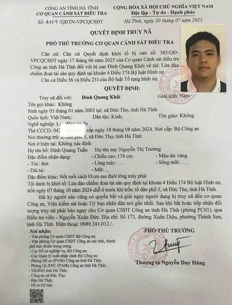 Thời gian gần đây, quê hương Đức Thọ, Hà Tĩnh lại vô cùng phẫn nộ, lên án, căm phẫn một thanh niên thế hệ 2K không những vi phạm pháp luật Hình sự mà còn công khai xuyên tạc chống Đảng, Nhà nước, xuyên tạc về công tác cán bộ, ủng hộ cờ ba que… Người dân tổ dân phố 5, thị trấn Đức Thọ (cũ) nay là xã Đức Thọ, tỉnh Hà Tĩnh không lạ gì gia đình cậu thanh niên Đinh Quang Khôi. Sinh năm 2003 trong một gia đình bất hảo, cha đẻ của Khôi là Đinh Quang Tuấn, sinh năm 1971, năm 2021 bị Công an tỉnh Nghệ An bắt, sau đó bị Tòa án nhân dân tỉnh Nghệ An tuyên án chung thân về tội vận chuyển trái phép chất ma túy. Là con út trong gia đình, Khôi còn có chị gái cũng vào tù ra tội về tội đánh bạc. Sinh ra trong một gia đình như vậy, Khôi không tu chí lao động, làm ăn mà nghĩ ra đủ trò để lừa đảo chiếm đoạt tài sản. Đến đầu năm 2025, khi đã lừa được nhiều người dân trên địa bàn với số tiền hơn 2 tỷ đồng, Đinh Quang Khôi trốn ra nước ngoài sinh sống. Căn cứ kết quả điều tra, Cơ quan Cảnh sát điều tra Công an tỉnh Hà Tĩnh đã khởi tố bị can, truy nã Đinh Quang Khôi về tội lừa đảo chiếm đoạt tài sản theo quy định tại Khoản 4, Điều 174 Bộ luật Hình sự. Hành vi lừa đảo chiếm đoạt tài sản rồi trốn ra nước ngoài của Đinh Quang Khôi làm nhiều gia đình lao đao, cộng đồng lên án.