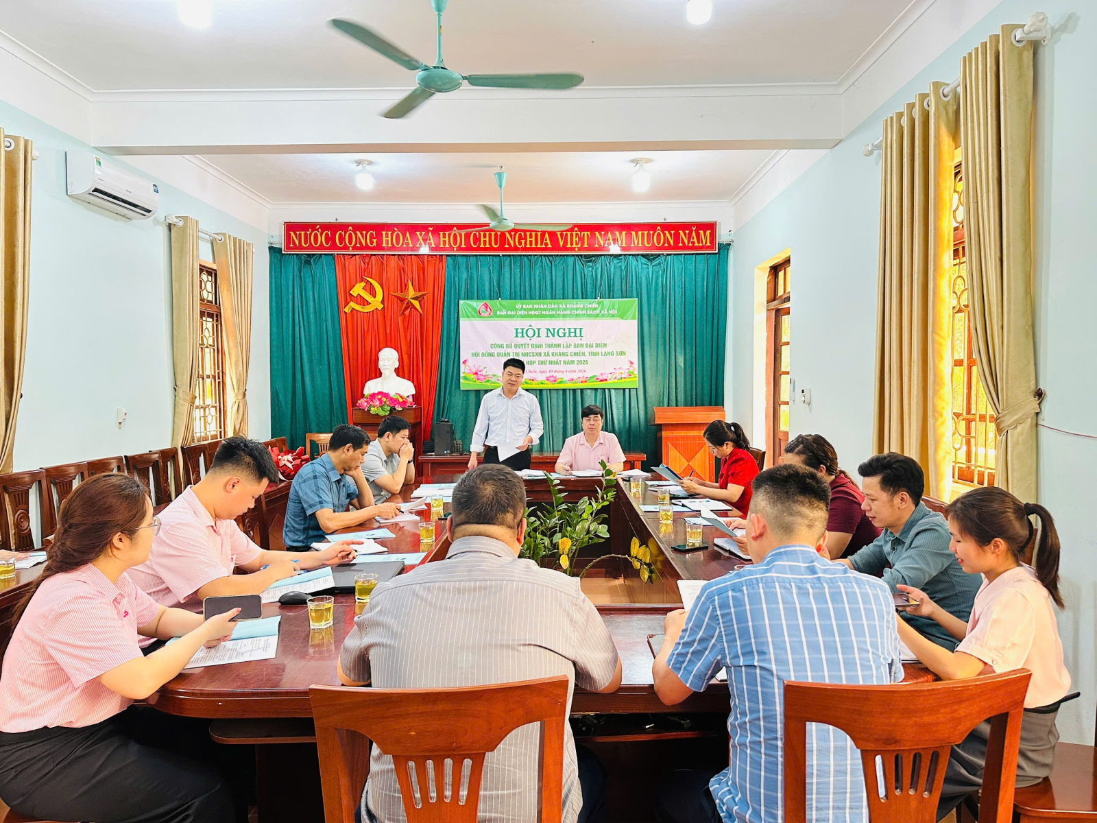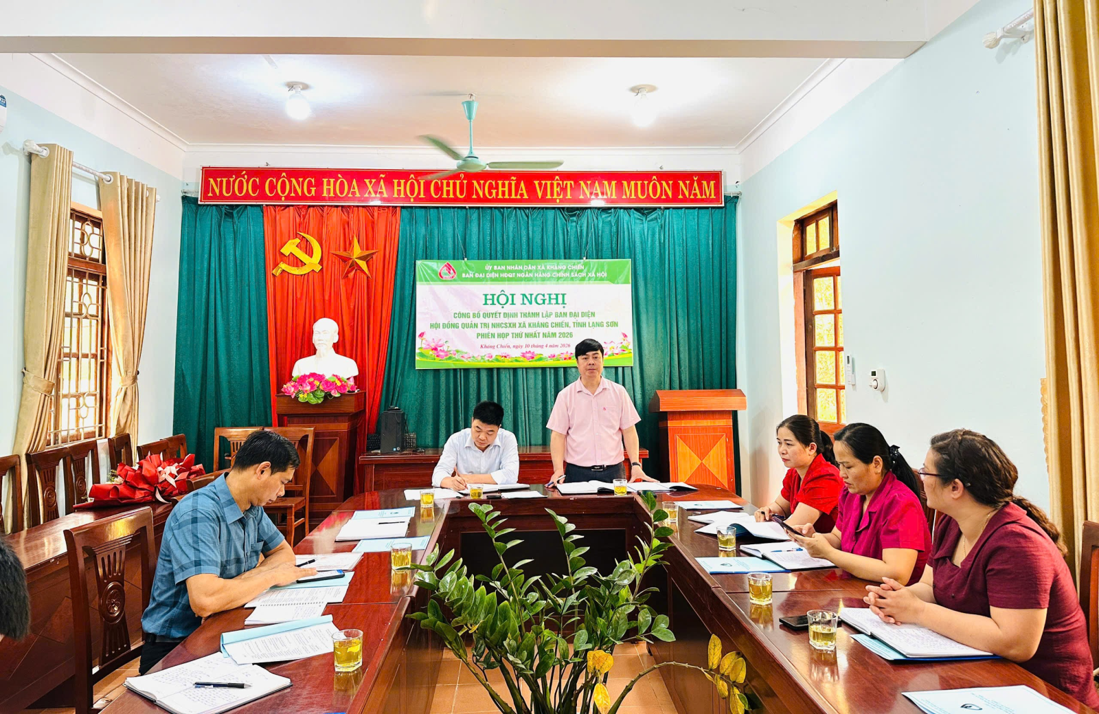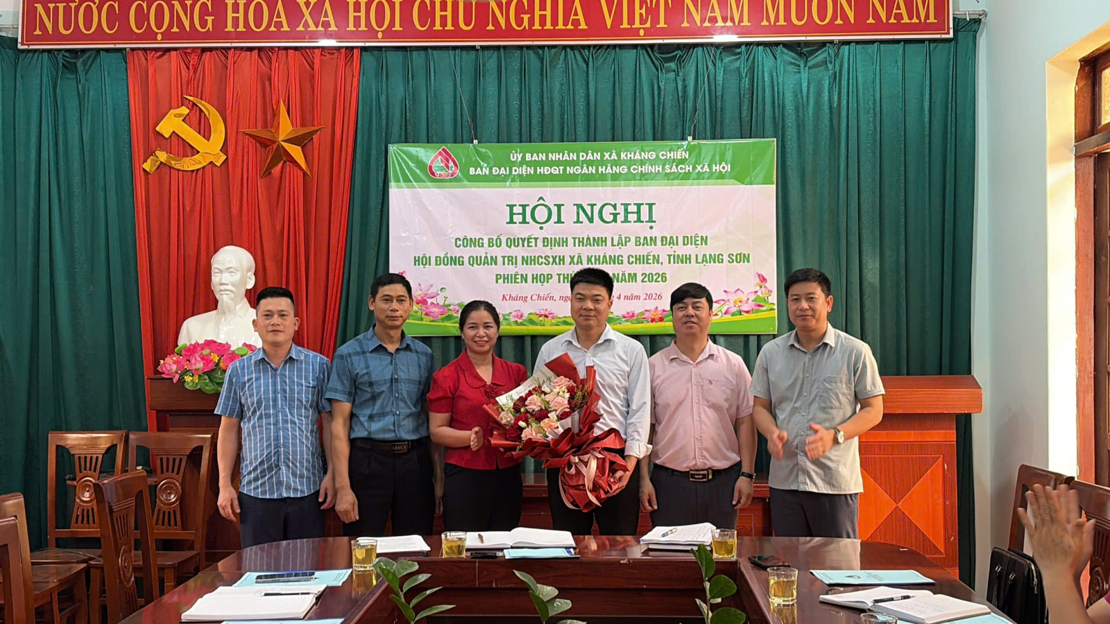 Chiều ngày 10/04/2026, UBND xã Kháng Chiến tổ chức công bố quyết định số 560/QĐ-UBND ngày 05/03/2026 của Chủ tịch Ủy ban nhân dân xã Kháng Chiến về việc thành lập Ban đại diện Hội đồng quản trị (HĐQT) Ngân hàng chính sách xã hội (NHCSXH) xã kháng Chiến, tỉnh Lạng Sơn.