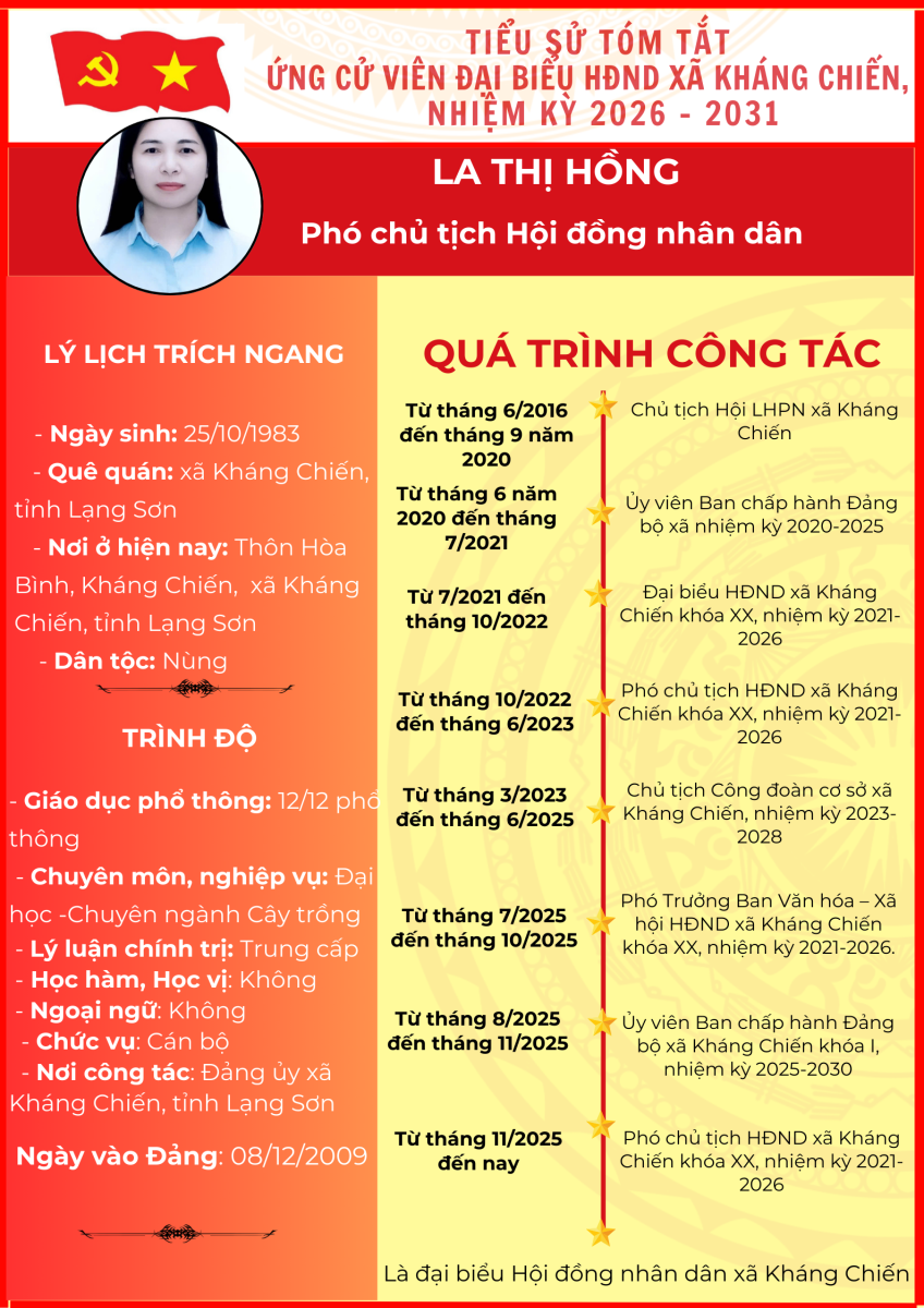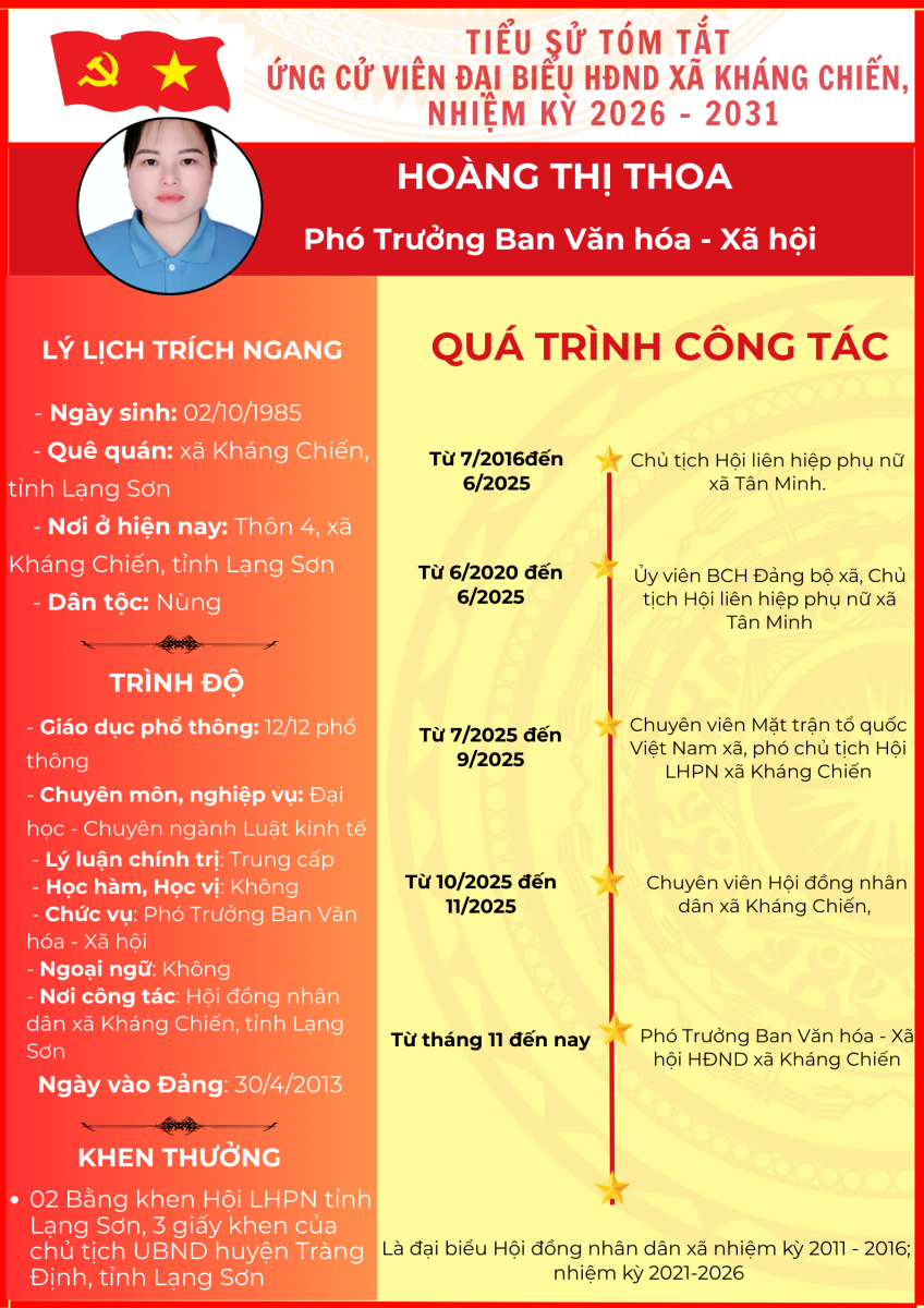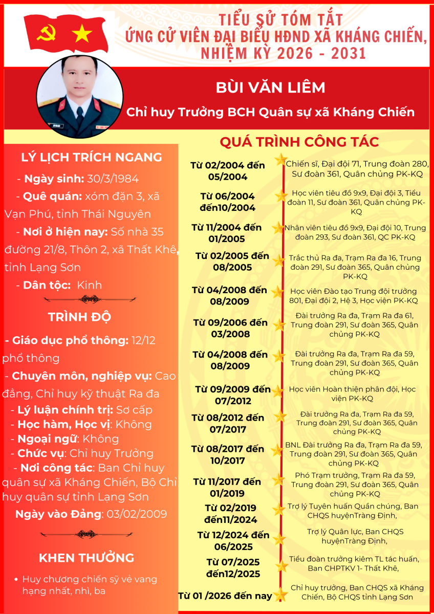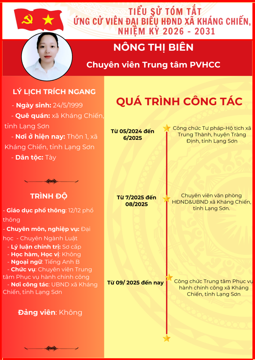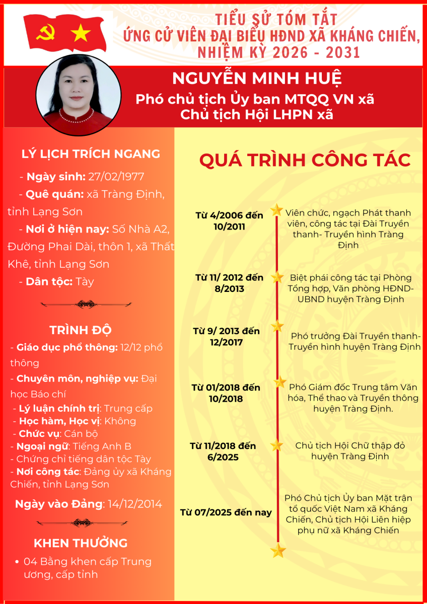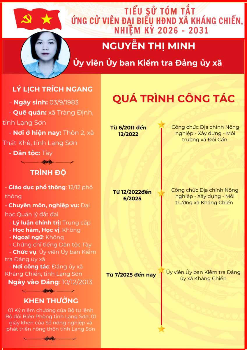 TIỂU SỬ TÓM TẮT (QUÁ TRÌNH CÔNG TÁC) CỦA NGƯỜI ỨNG CỬ ĐẠI BIỂU HỘI ĐỒNG NHÂN DÂN XÃ KHÁNG CHIẾN NHIỆM KỲ 2026 - 2031