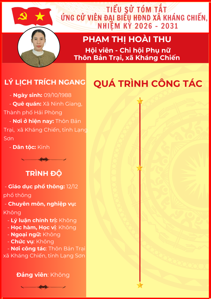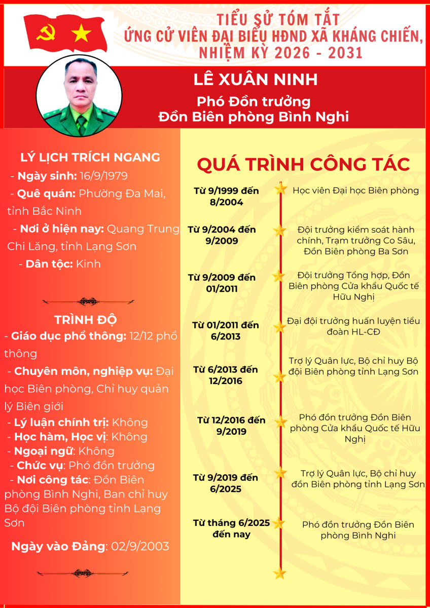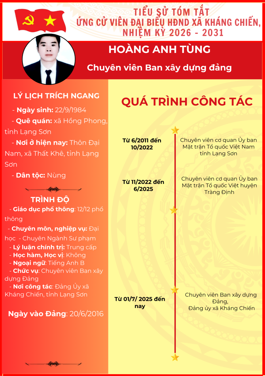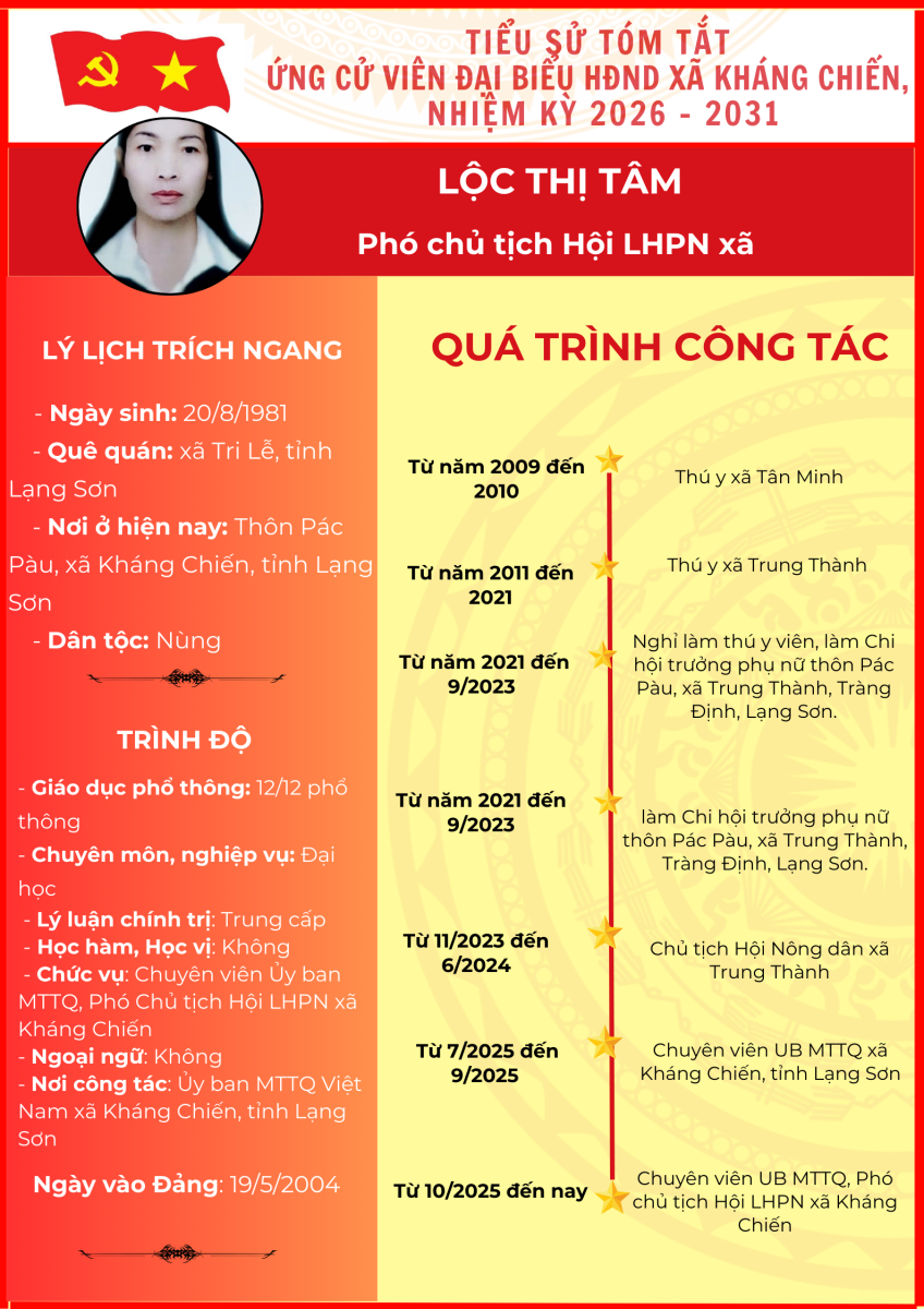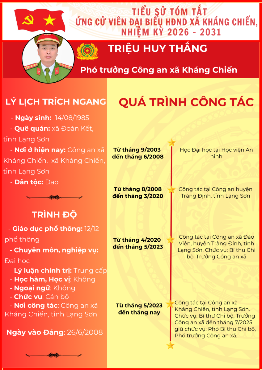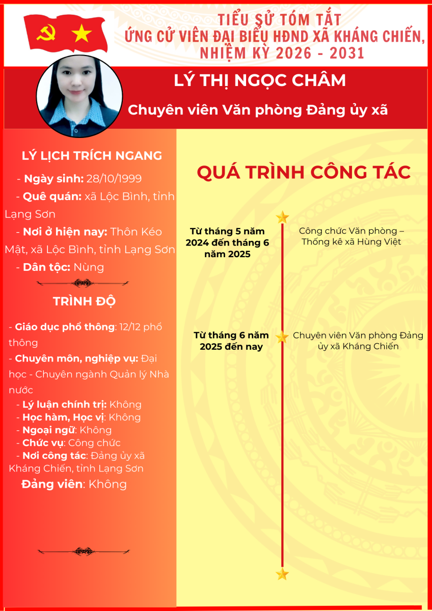 TIỂU SỬ TÓM TẮT (QUÁ TRÌNH CÔNG TÁC) CỦA NGƯỜI ỨNG CỬ ĐẠI BIỂU HỘI ĐỒNG NHÂN DÂN XÃ KHÁNG CHIẾN NHIỆM KỲ 2026 - 2031