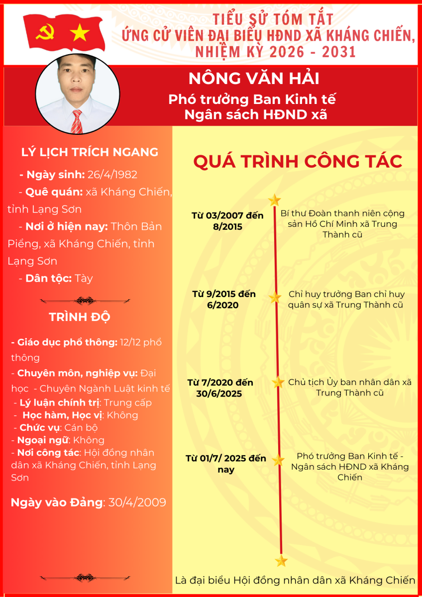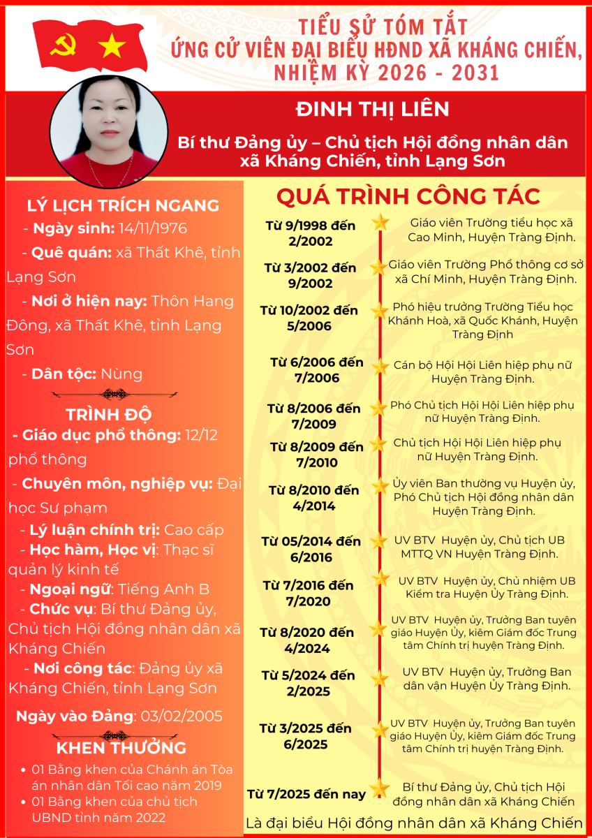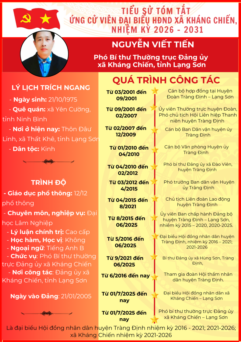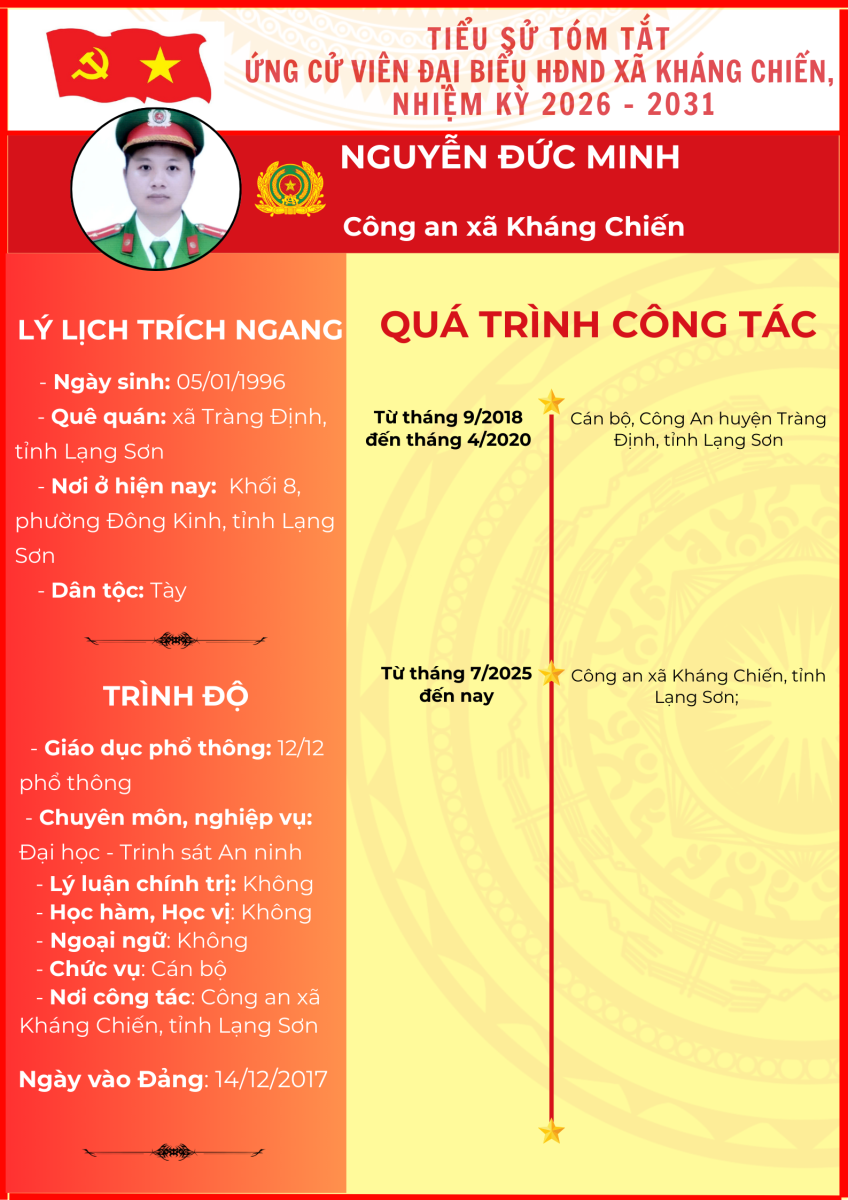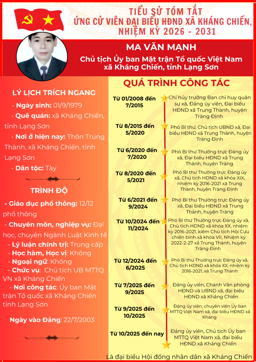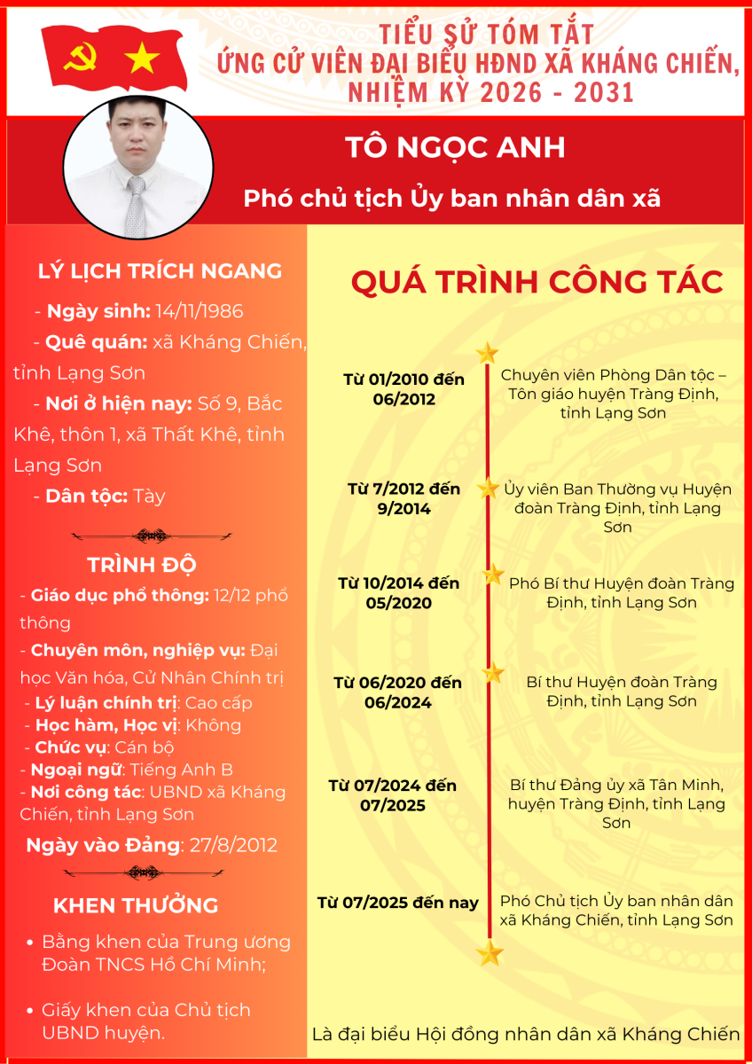 TIỂU SỬ TÓM TẮT (QUÁ TRÌNH CÔNG TÁC) CỦA NGƯỜI ỨNG CỬ ĐẠI BIỂU HỘI ĐỒNG NHÂN DÂN XÃ KHÁNG CHIẾN NHIỆM KỲ 2026 - 2031