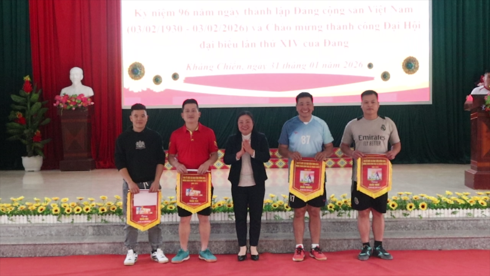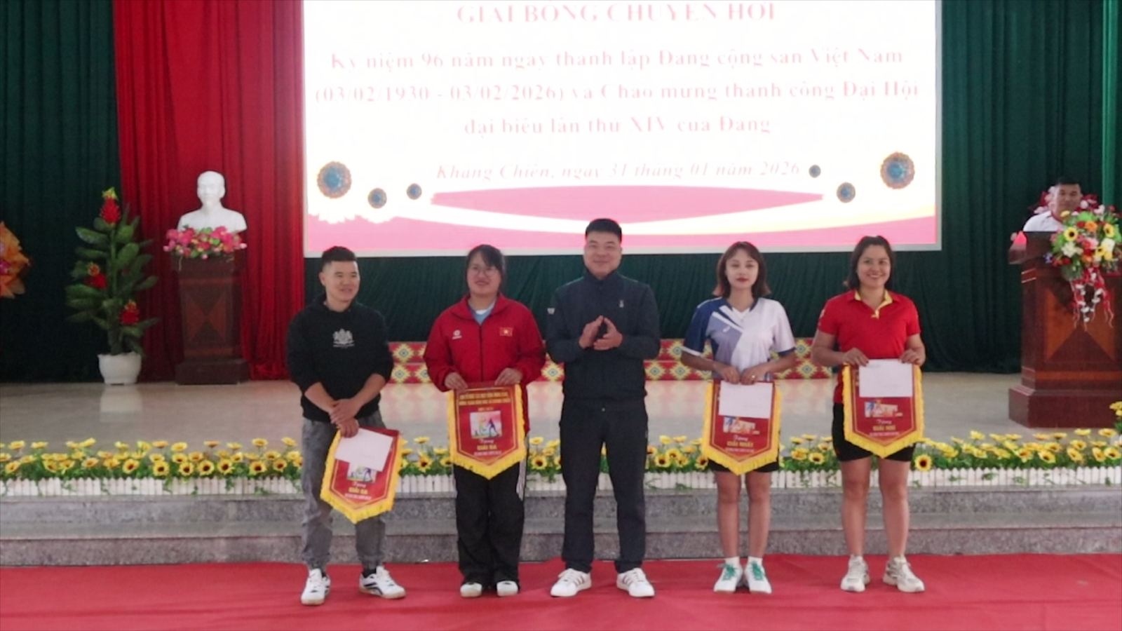 “Đồng chí Lương Trung Thuyền. Phó Bí thư, Chủ tịch UBND xã Kháng Chiến trao giải nhất cho đội bóng nữ của Trạm y tế xã”.