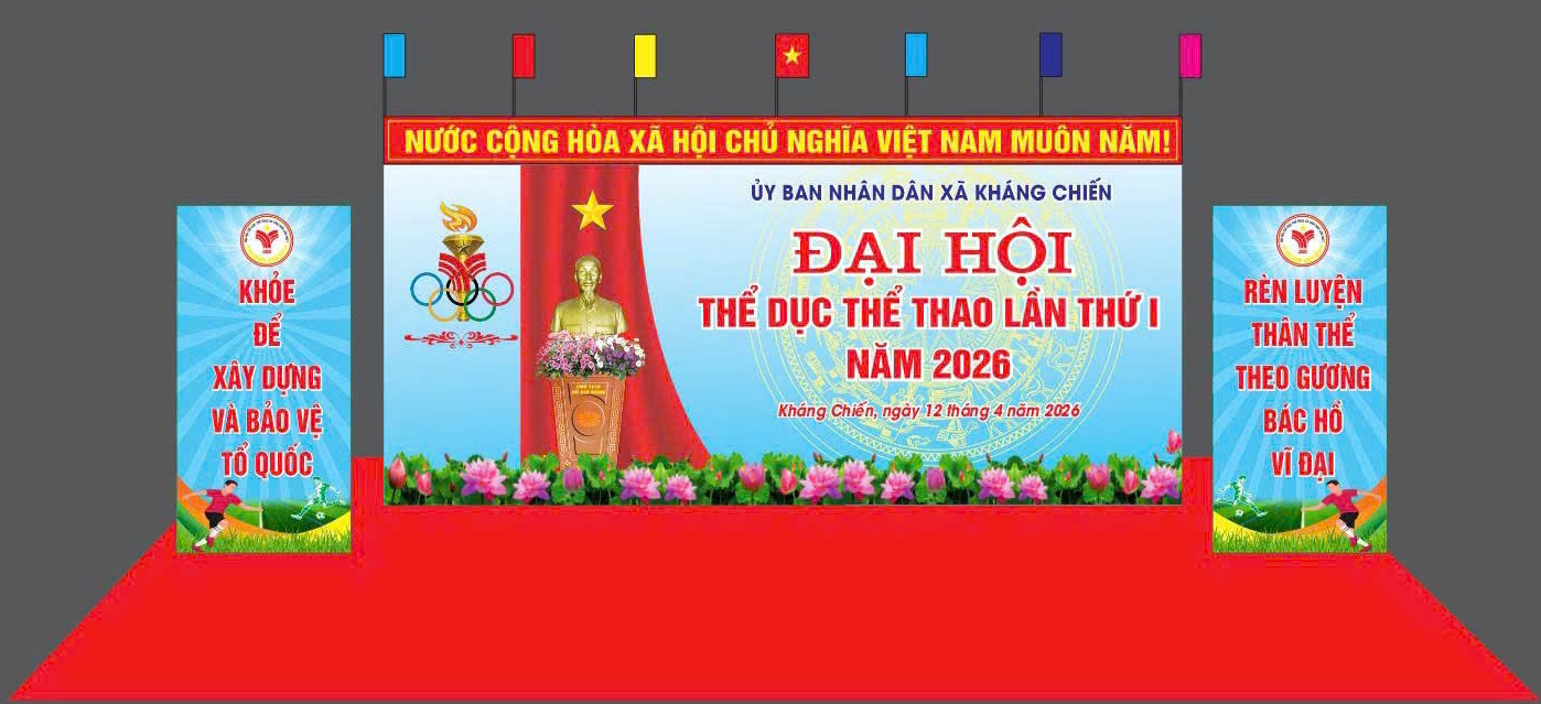 Thưa quý vị và bà con nhân dân. Trong 02 ngày 11,12/4/2026. UBND xã Kháng Chiến tổ chức Đại hội Thể dục Thể thao lần thứ I năm 2026. Đại hội được tổ chức với 5 môn thi đấu: Cờ tướng, Bắn nỏ, Điền kinh, Đẩy gậy, Kéo co.